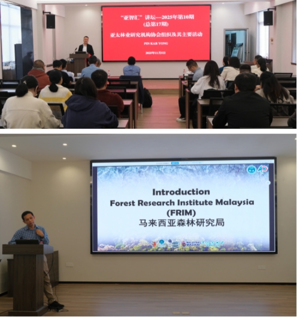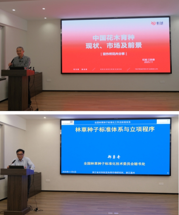 2025年11月5日,亚作所2025年第10期“亚智汇”讲坛(总第17期)成功举办。林木花卉领域学科组特邀马来西亚亚太林业协会秘书长PIN KAR YONG博士、虹越花卉股份有限公司董事长江胜德高级工程师和中国林业科学研究院郑勇奇研究员三位专家到所交流指导。所党委书记、所长陈秋夏,副所长郑坚、副所长王金旺及全所科技人员、研究生、温州市林木花卉育种协作组成员、相关花卉企业代表参加会议。活动副所长郑坚主持。