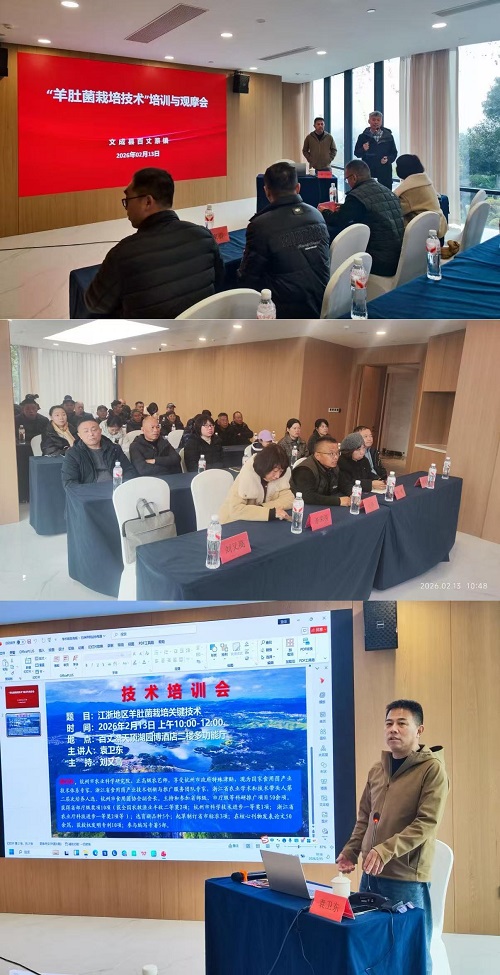 岁除前夕,正值羊肚菌出菇栽培管理关键窗口期,为精准助力羊肚菌栽培技术提升,强化食用菌从业人员技能培养,助推温州市食用菌产业高质量发展,2026年2月13日,亚作所虫生真菌资源开发与利用学科团队联合文成县凯顺家庭农场在文成县百丈漈镇成功举办“羊肚菌栽培技术培训与现场观摩会”。那曲市科学技术副局长扎西(温州市科学技术局挂职)、文成县科学技术局党组成员苏荣英、文成县百丈漈镇副镇长陈奇等领导莅临指导,派驻文成县省个人科技特派员厉晓腊特邀杭州市农业科学研究院正高级农艺师袁卫东为来自温州鹿城、瓯海、瑞安、文成、平阳、泰顺等县市区的羊肚菌种植户、食用菌爱好者及农技管理者等50余人授课培训。 培训会上,袁卫东以 “江浙地区羊肚菌栽培关键技术”为题,围绕羊肚菌栽培现状、入行前规划、羊肚菌栽培关键技术要点、采收与加工及病虫害防控等方面进行详细讲解,针对羊肚菌不耐高温和浙南地区忽冷忽热的气候特点,提供多套降温防冻应对解决方案,并耐心解答学员们的疑点和生产中遇到的难题。 观摩会上,文成县凯顺家庭农场负责人叶财彬详细介绍了基地羊肚菌种植情况,学员们深入考察了种植环境和子实体长势,并就进一步优化种植技术、提高产量和品质等问题展开深度探讨。专家们提出了一系列具有高度针对性和可操作性的精准措施与建议。 本次活动成功搭建了羊肚菌产研深度融合的交流平台,通过“专家讲解+田间观摩+互动答疑”模式,为从业人员提供了精准“技术施肥”,也为温州市食用菌产业高质量发展注入了“智慧动能”。 会前,虫生真菌资源开发与利用学科团队与扎西副局长、袁卫东正高级农艺师就食药用菌方面的技术分享与合作进行了深入探讨。 |