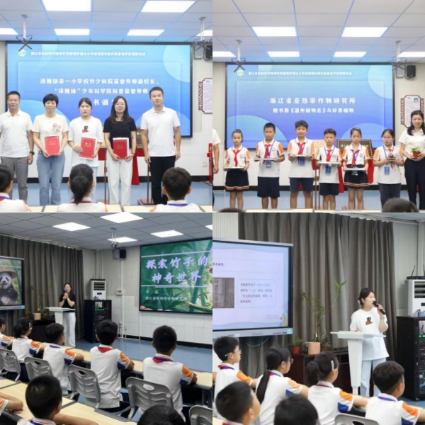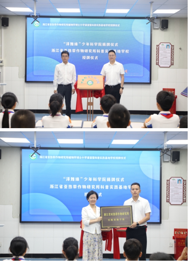 9月22日上午,2025年瓯海区 “全国科普月” 系列活动——浙江省亚热带作物研究所植物学博士进小学课堂暨科普实践基地学校授牌仪式、“泽雅绿” 少年科学院成立仪式,在瓯海区泽雅镇第一小学举行。浙江省亚热带作物研究所主动响应国家“全民科学素质行动”号召,将前沿科学课堂与珍贵的科普资源送达乡村孩子身边。瓯海区副区长张昶、泽雅镇王瓒书记、泽雅镇副镇长陈铖、瓯海区科学技术协会主席翁振瓯书记及瓯海区教育局党委委员潘时晖等参加了本次科普活动。